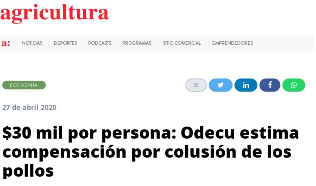 La Organización de Consumidores y Usuarios (ODECU) publicó un informe preliminar en que estimó en $450 mil millones de pesos el daño causado a la población por la colusión de los supermercado en los precios de los pollos.