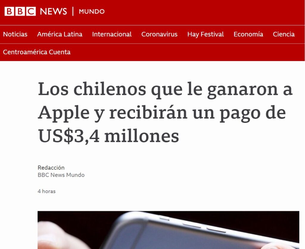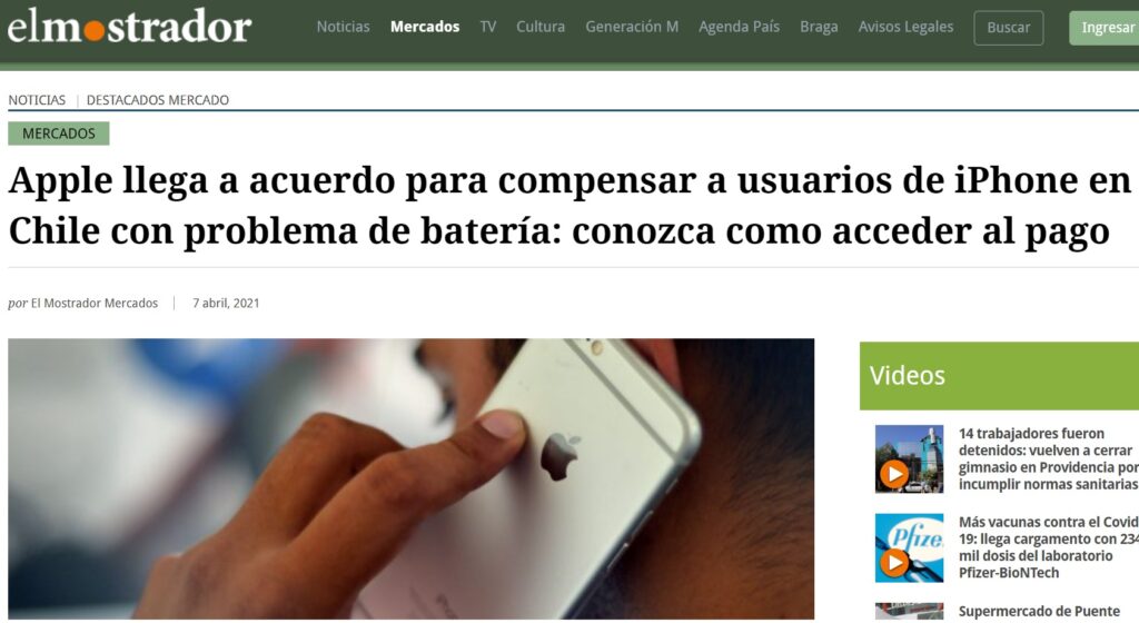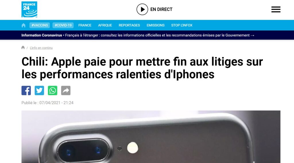 Fuente: France 24Fecha: 8 de abril 2021 Apple a conclu un accord de 3,4 millions de dollars (2,86 millions d\’euros) avec une association de consommateurs chiliens pour régler une action collective pour obsolescence programmée de certains de ses téléphones, une première en Amérique latine, a annoncé mercredi l\’avocat des plaignants.