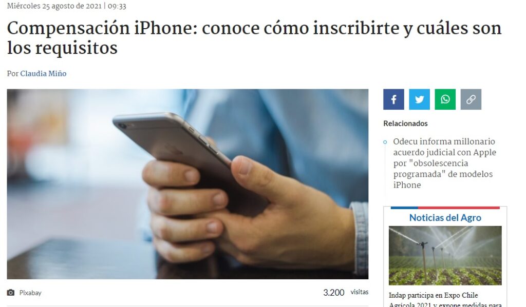 Fuente: Radio Bío-BíoFecha: 25 de agosto 2021 La Organización de Consumidores y Usuarios (Odecu) anunció el inicio de las inscripciones para la denominada Compensación iPhone. Se trata del pago de compensaciones para dueños de iPhone, contempladas en el acuerdo conciliatorio con Apple Chile, MacOnline y Reifschneider, que son los representantes locales de la marca.