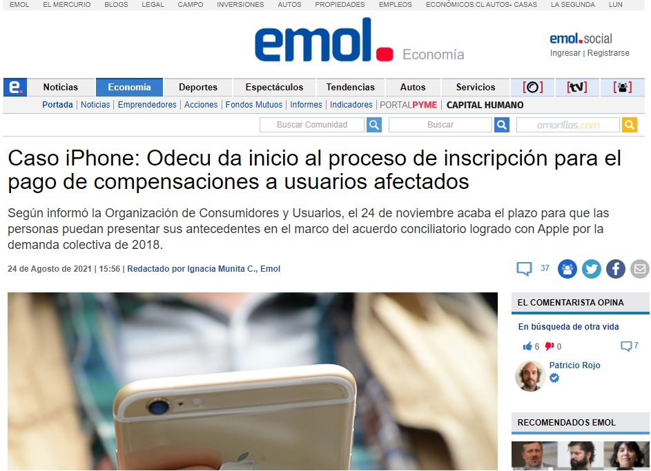 Fuente: EmolFecha: 25 de agosto 2021 Según informó la Organización de Consumidores y Usuarios, el 24 de noviembre acaba el plazo para que las personas puedan presentar sus antecedentes en el marco del acuerdo conciliatorio logrado con Apple por la demanda colectiva de 2018.