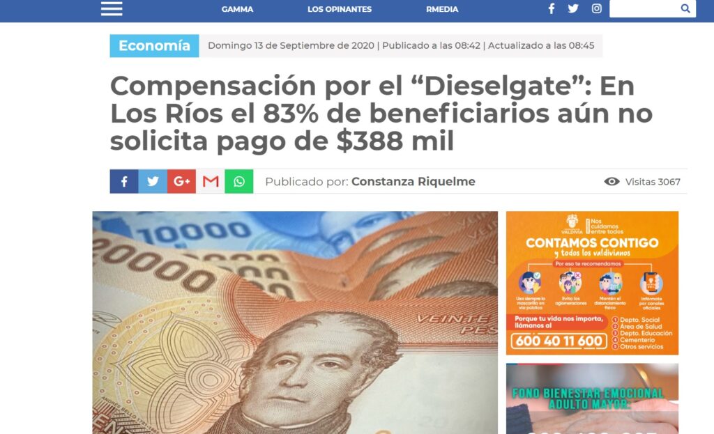 La Organización de Consumidores y Usarios (ODECU) dio a conocer que sólo 20 propietarios, es decir, el 17% del total de la Región de Los Ríos de los vehículos involucrados han recibido el pago de la compensación individual en el contexto de la demanda colectiva interpuesta por aproximadamente 5 mil dueños de vehículos diésel de las marcas Volkswagen, Audi, Škoda y Porsche que se comercializaron en Chile.