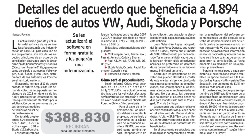 La actualización gratuita y voluntaria del software de los vehículos afectados, más una indemnización de $388.830 para cada uno de sus propietarios, son dos de los aspectos principales de un acuerdo de conciliación alcanzado entre la Organización de Consumidores y Usuarios (ODECU) con Porsche Chile, que representa en el país a las marcas Volkswagen, Audi, Škoda, y con Ditec, distribuidora de los automóviles Porsche en el territorio nacional.