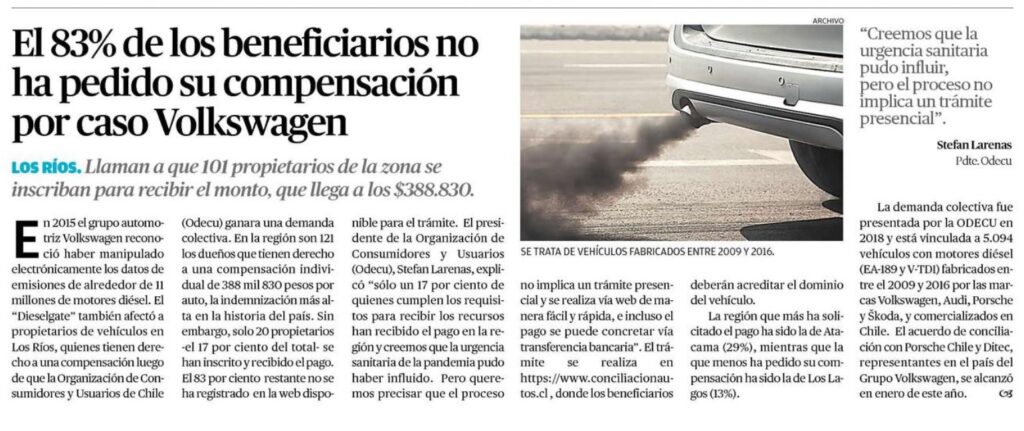 La demanda colectiva fue presentada por la ODECU en 2018 y está vinculada a 5.094 vehículos con motores diésel (EA-189 y V-TDI) fabricados entre el 2009 y 2016 por las marcas Volkswagen, Audi, Porsche y Skoda, y comercializados en Chile. El acuerdo de conciliación con Porsche Chile y Ditec, representantes en el país del Grupo Volkswagen, se alcanzó en enero de este año.