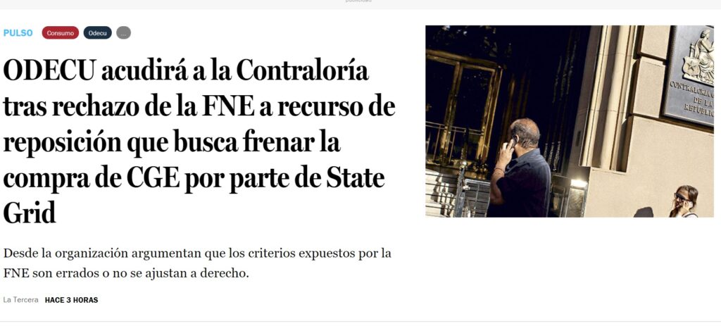 La Organización de Consumidores y Usuarios (Odecu) recurrirá a la Contraloría de la República en el marco de la última decisión de la Fiscalía Nacional Económica (FNE) respecto a la compra de la Compañía General de Electricidad (CGE) por parte la empresa de capitales chinos State Grid.