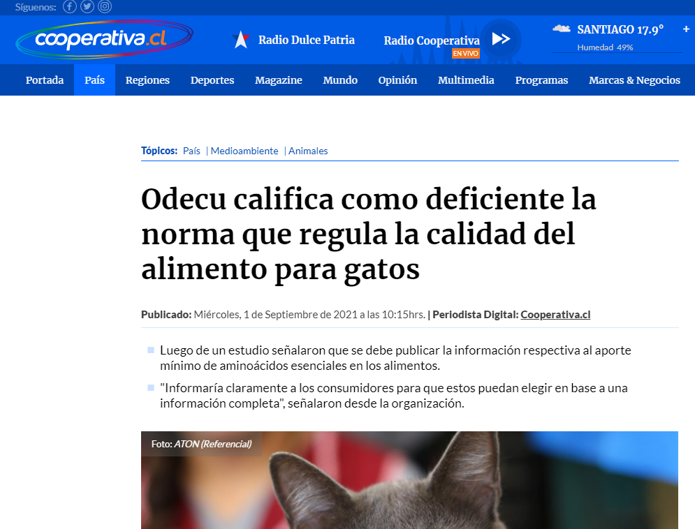 \»Es de suma importancia y urgencia que la norma chilena NCh2546 sea actualizada, incluyendo la obligatoriedad de la información del aporte mínimo de aminoácidos esenciales en los alimentos para gatos y, además, que establezca un patrón único de la entrega de la información nutricional en los envases\», señalaron un comunicado.
