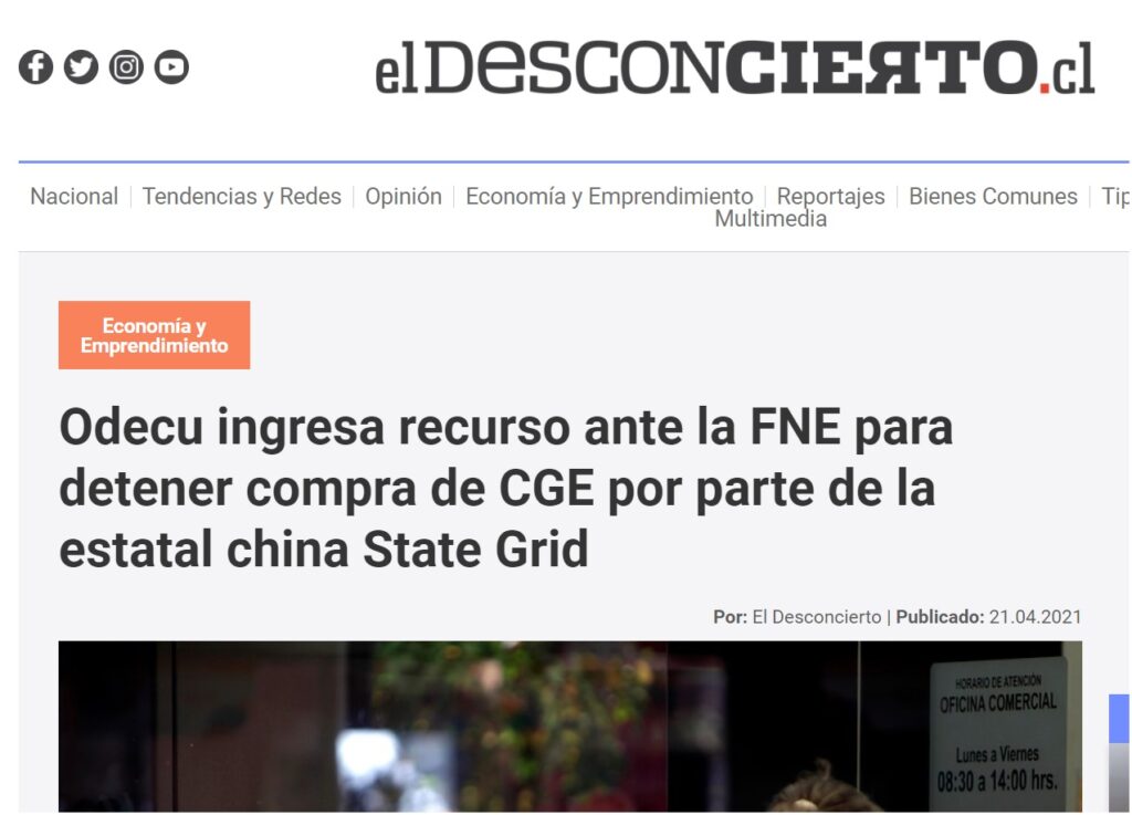 La Organización de Consumidores y Usuarios (Odecu) presentó un recurso de reposición ante la Fiscalía Nacional Económica (FNE) para frenar la adquisición de la empresa eléctrica CGE por parte de la estatal de origen chino State Grid.