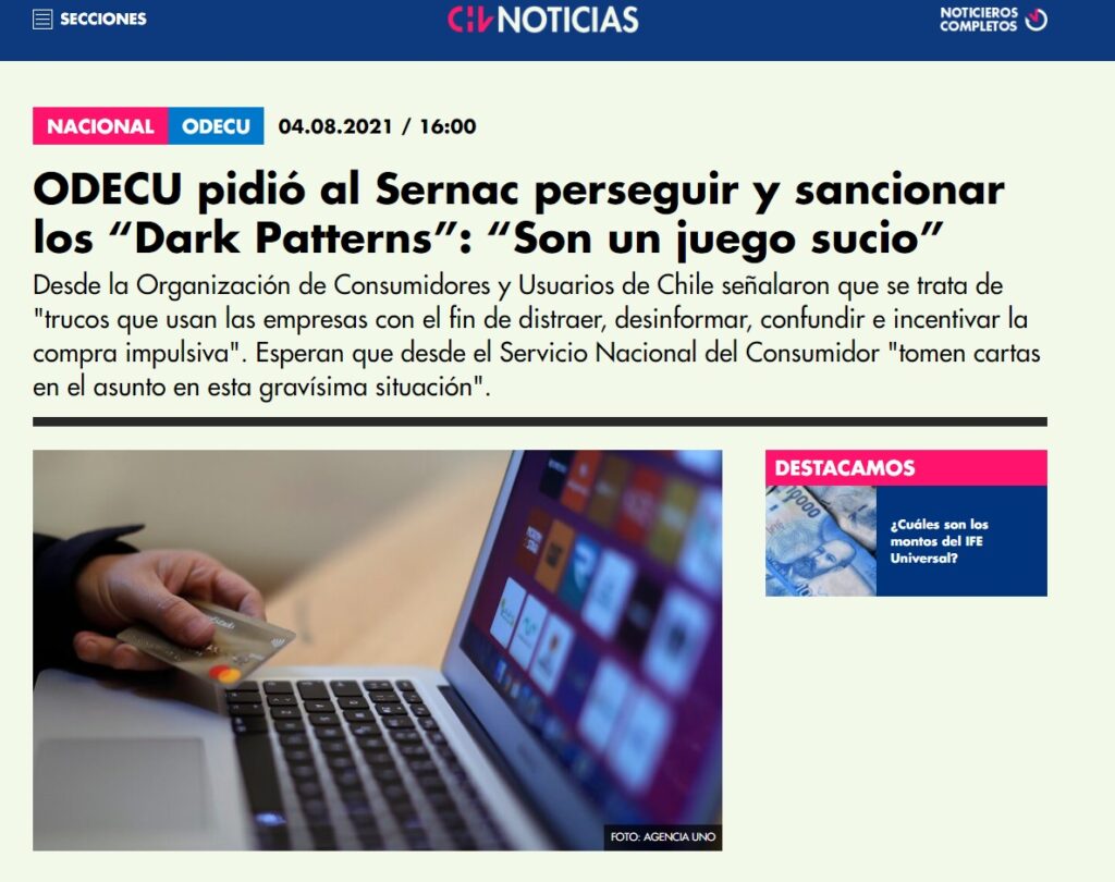 ODECU señaló que “hemos conocido un estudio del Sernac, el cual denuncia los denominados Dark Patterns. Los así llamados ‘Patrones Oscuros’, son trucos que usan las empresas con el fin de distraer, desinformar, confundir e incentivar la compra impulsiva, además de tener que entregar sus datos personales. Estos son derechamente un juego sucio y evidentes infracciones a la ley del consumidor”.