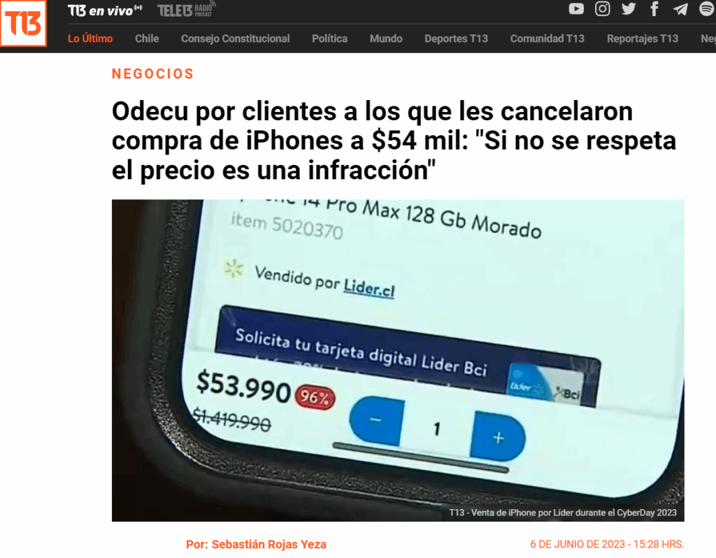 El presidente de la Organización de Consumidores y Usuarios (Odecu)Stefan Larenas, abordó el caso de los clientes que compraron varios iPhone a $54 mil pesos y enfatizó que \»cuando no se respeta el precio es derechamente una infracción\».