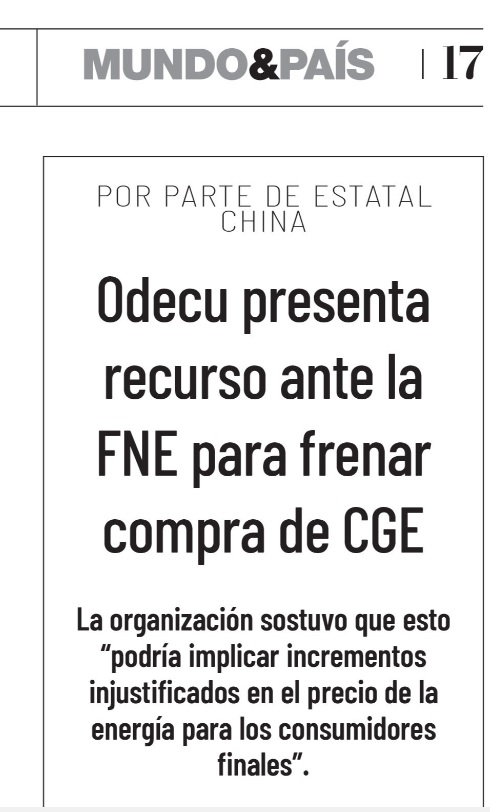 La Organización de Consumidores y Usuarios, ODECU, presentó un recurso de reposición ante la Fiscalía Nacional Económica para frenar adquisición de la empresa eléctrica CGE por parte de la estatal de origen chino State Grid. \’La operación económica implicará para CGE un grado de integración vertical, en lo que respecta a generación y distribución de energía que, de acuerdo con la abundante experiencia internacional, podría implicar incrementos injustificados en el precio de la energía para los consumidores finales\’, indica ODECU. Además, sostiene en un comunicado que la Fiscalía Nacional Económica no explicó sus razones para aplicar ciertas medidas ante esta adquisición, que a su juicio perjudicaría a los consumidores.