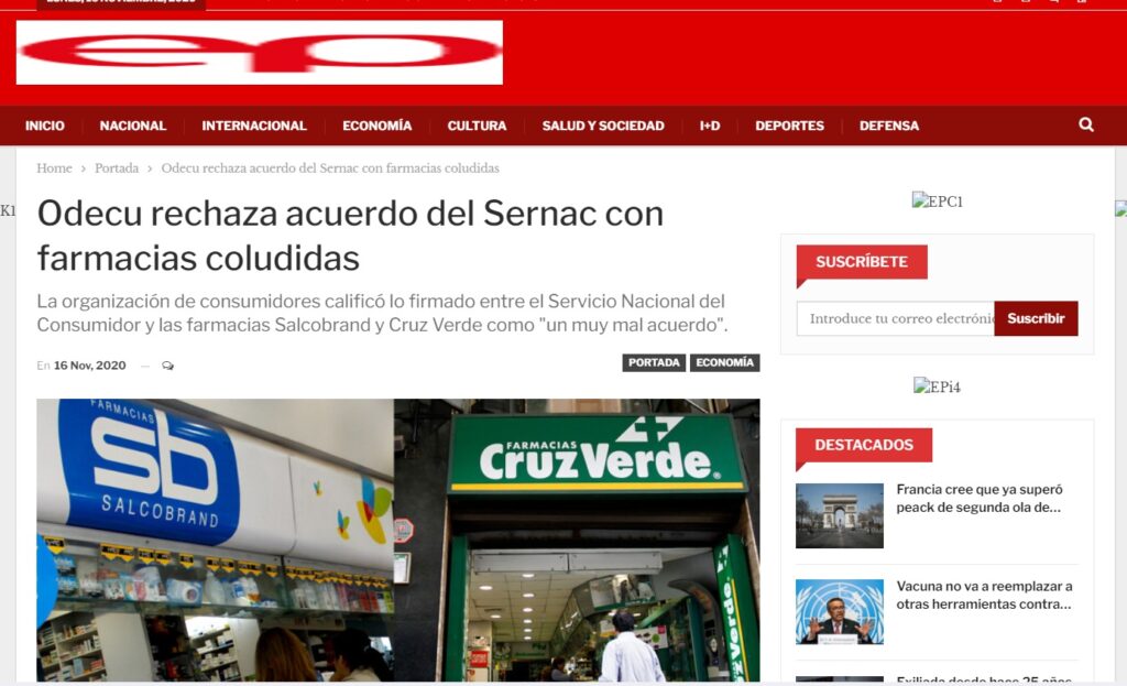 La organización de consumidores calificó lo firmado entre el Servicio Nacional del Consumidor y las farmacias Salcobrand y Cruz Verde como \»un muy mal acuerdo\».