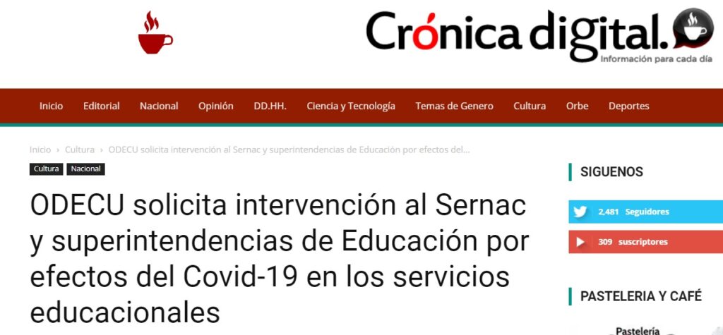 La Organización de Consumidores y Usuarios, ODECU, solicitud de intervención y del ejercicio de las facultades legales que les otorga la institucionalidad determinando la procedencia y requisitos mínimos de la educación a distancia en cada uno de los niveles, y sus efectos sobre el monto y la proporcionalidad de las mensualidades.