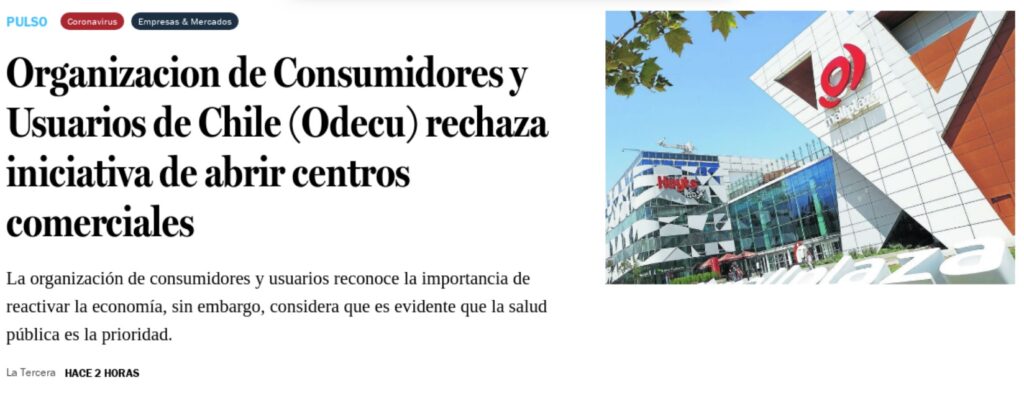 La Organizacion de Consumidores y Usuarios de Chile (ODECU), dio a conocer su rechazo ante la puesta en marcha de determinadas labores productivas y la apertura gradual de los centros comerciales en plena emergencia sanitaria.