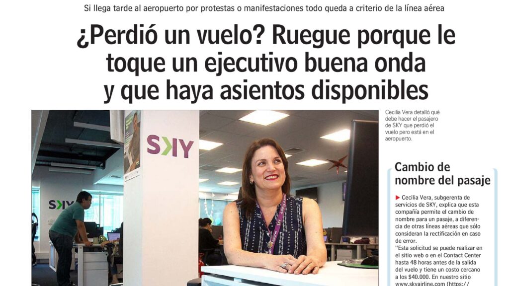 Los pasajes en oferta suelen no considerar cambio alguno. Es decir, si no llegó a la hora, pierde el dinero. Vera explica los procesos de SKY para estas circunstancias: \’En caso de que un pasajero está atrasado pero en el aeropuerto, puede tomar el siguiente vuelo. Debe acercarse y solicitarlo en el counter del aeropuerto o bien, a través del Contact Center por teléfono o chat.
